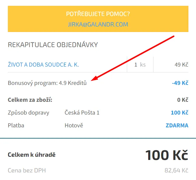 The most important element of the system is displayed in the last step of the bypass. Here, customers can draw their credits in order to discount their order. This element can be moved to the first step of the order if the e-shop has disabled support for unregistered customers. This move is a customization and please contact our support for it.