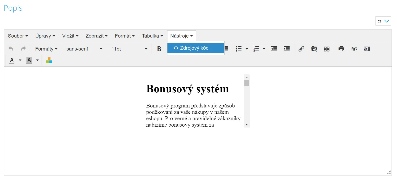 Save the article in Shoptet and you're done. If you have other requirements for the article, you can create it according to your own needs. Just enter the URL in the system settings so that when customers click on the links, they will be taken to your article with a description of the bonus system.